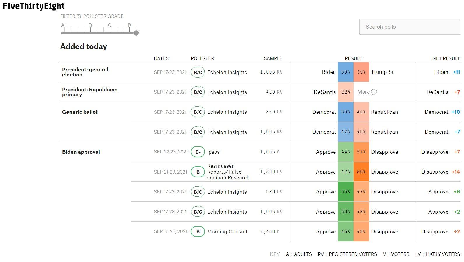 If you want to follow American opinion, FiveThirtyEight’s Latest Polls is about the best place to look. Here’s today’s. I don’t see much in the way of GOP bright spots in it, do you? Right click on the image and select “Open image in new tab” to see it larger and more readable.