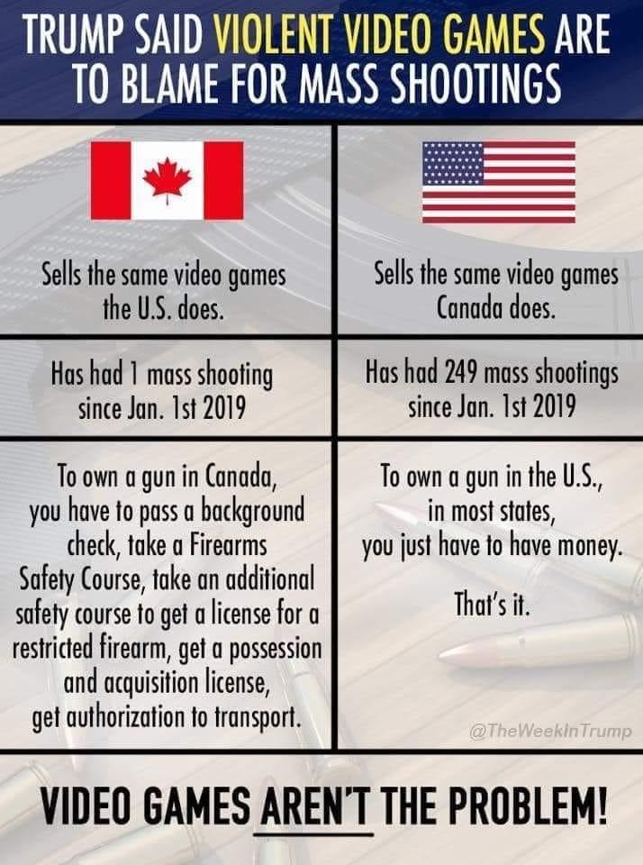 DavisParticipantI cannot confirm all of this information because regulations vary from province to province and state to state. But the idea is correct, that it is one of President Suck-face’s more deplorable actions: diverting attention away from weapons of murder to video games. He’s just playing from the new Republic playbook…dirty tactics and unashamed lies to get the policy you want passed at any cost.