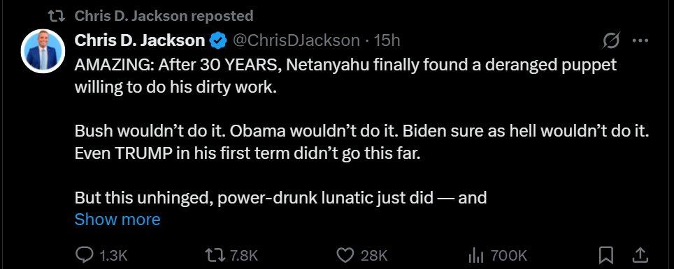 UnseenParticipantTime to set Jew vs. Palestinian aside for a bit. Trump just dragged the U.S. into the Israel/Iran conflict. “What Bibi wants, Bibi gets.”