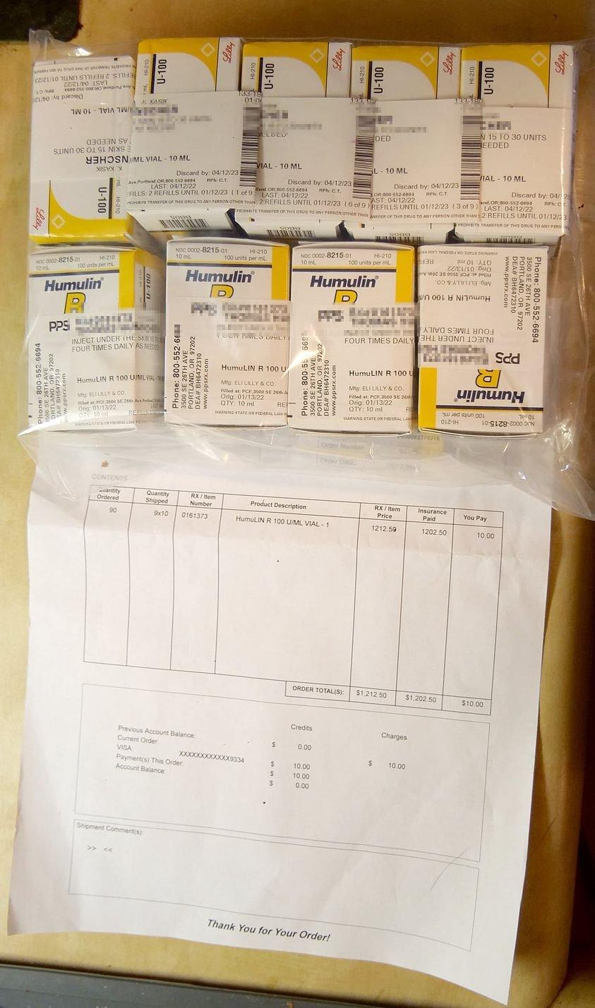 The wacky thing is that, with my Medicare Advantage Plan from Providence, my cost for five vials is only $5.56, so I pay around $920 less than the uninsured person. You think I’m kidding? I’m showing you a recent shipment of Humulin Insulin R for which I was charged $10. And since it comes basically overnight packed in ice packets, that $10 may not even cover the cost of the postage.